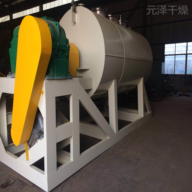 被干燥物料從殼體上方正中間加入,在不斷轉(zhuǎn)動(dòng)的耙齒的攪拌下,物料與殼體壁接觸時(shí),表面不斷更新,被干燥物料受到蒸汽間接加熱,而使物料水分氣化,氣化的水分由真空泵及時(shí)抽走,該機(jī)可同時(shí)采用夾層與耙齒同時(shí)加熱方式,傳熱面積更大,熱效率高,使其獲得更高的干燥效率。由于操作真空度較高,被干燥物料表面水蒸氣壓力遠(yuǎn)大于干燥機(jī)殼體內(nèi)蒸發(fā)空間的水蒸氣壓力,從而有利于被干燥物料內(nèi)部水分和表面水分的排出,有利于被干燥物料的水分子運(yùn)動(dòng),達(dá)到干燥目的。