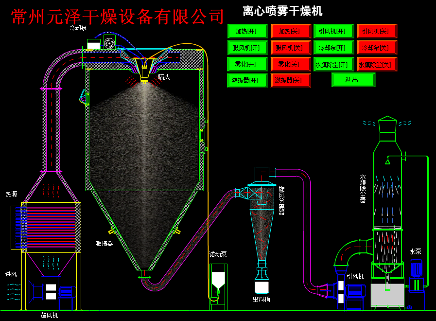 空氣通過(guò)過(guò)濾器和加熱裝置后,進(jìn)入離心噴霧干燥機(jī)干燥室頂部的熱空氣分配器。 通過(guò)熱空氣分配器的熱空氣以螺旋狀均勻地進(jìn)入干燥室。 同時(shí),泵將液體送至安裝在干燥室頂部的離心噴霧器。 在頭部中,液體材料被噴成極小的霧狀液滴,這大大增加了液體材料與熱空氣接觸的比表面積。 小滴和熱空氣平行下沉,水迅速蒸發(fā)并在很短的時(shí)間內(nèi)干燥成顆粒。 它被收集在塔和旋風(fēng)分離器的底部,廢氣被排放到外部。