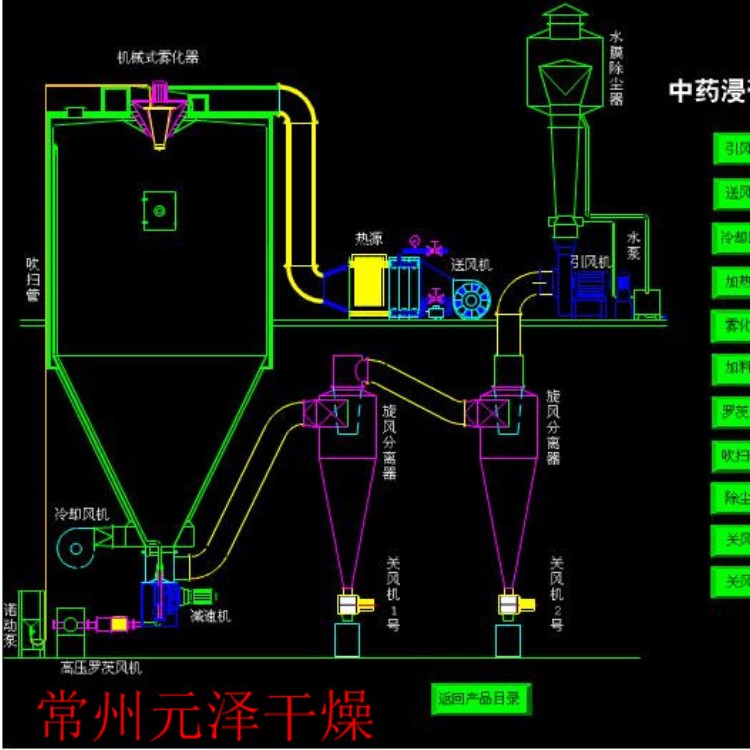 噴霧干燥機(jī)為開(kāi)式循環(huán),并流式,離心式霧化。干燥介質(zhì)空氣經(jīng)過(guò)初、中效空氣過(guò)濾器過(guò)濾后根據(jù)操作指令由鼓風(fēng)機(jī)吸取再經(jīng)加熱器加熱通過(guò)高效過(guò)濾器的熱風(fēng)分配器進(jìn)入噴霧干燥主塔。液體物料根據(jù)操作指令經(jīng)過(guò)蠕動(dòng)泵,進(jìn)入高速旋轉(zhuǎn)的離心噴頭,在離心力作用下被分散成小霧滴。在噴霧干燥主塔內(nèi),小霧滴與熱風(fēng)在充分接觸,沿其特定路徑進(jìn)行熱交換后被干燥成為產(chǎn)品,然后通過(guò)旋風(fēng)分離器實(shí)現(xiàn)分離,固體物料被收集,氣體介質(zhì)再經(jīng)過(guò)過(guò)濾后被排出。整套噴霧系統(tǒng)易清潔,符合GMP要求。