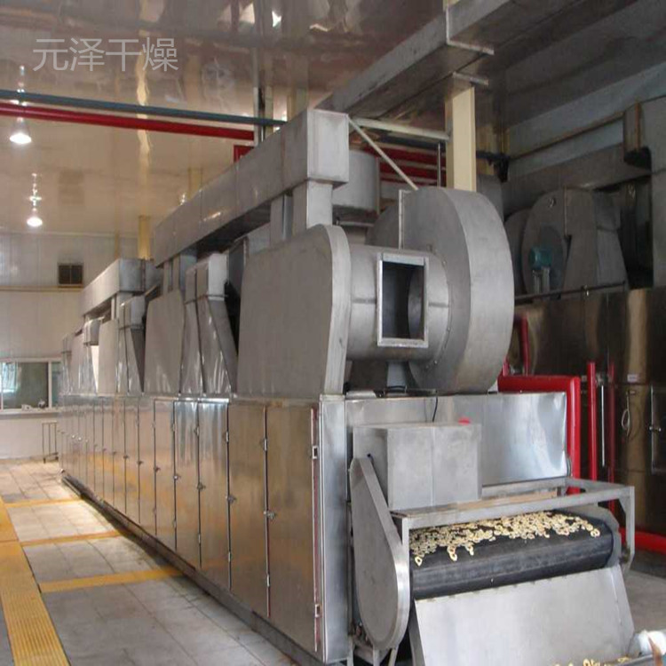 物料由加料器均勻地鋪在網(wǎng)帶上,網(wǎng)帶一般采用12-60目不銹鋼絲網(wǎng),由傳動(dòng)裝置拖動(dòng)在干燥機(jī)內(nèi)移動(dòng)。干燥機(jī)由若干單元組成,每一單元熱風(fēng)獨(dú)立循環(huán),部分尾氣由專(zhuān)門(mén)排濕風(fēng)機(jī)排出,廢氣由調(diào)節(jié)閥控制,熱氣由下往上或由上往下穿過(guò)鋪滿物料的網(wǎng)帶完成熱量與質(zhì)量傳遞的進(jìn)程,帶走物料水份。網(wǎng)帶緩慢移動(dòng),運(yùn)行速度可根據(jù)物料溫度自由調(diào)節(jié),干燥后的成品連續(xù)落入收料器中。上下循環(huán)單元根據(jù)用戶需要可靈活配備,單元數(shù)量亦可根據(jù)需要選取。