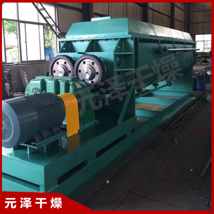 空心軸上密集排列著楔型中空漿葉,熱介質(zhì)經(jīng)空心軸流經(jīng)漿葉。單位有效容積內(nèi)傳熱面積很大,熱介質(zhì)溫度從-40℃到320℃,可以是水蒸汽,也可以是液體型:如熱水、導(dǎo)熱油等。間接傳導(dǎo)加熱,沒有攜帶空氣帶走熱量,熱量均用來加熱物料。熱量損失僅為通過器體保溫層向環(huán)境的散熱。楔型漿葉傳熱面具有自清潔功能。物料顆粒與楔型面的相對(duì)運(yùn)動(dòng)產(chǎn)生洗刷作用,能夠洗刷掉楔型面上附著物料,使運(yùn)轉(zhuǎn)中一直保持著清潔的傳熱面。漿葉干燥機(jī)的殼體為Ω型,殼體內(nèi)一般安排二到四根空心攪拌軸。殼體有密封端蓋與上蓋,防止物料粉塵外泄而充分發(fā)揮作用。