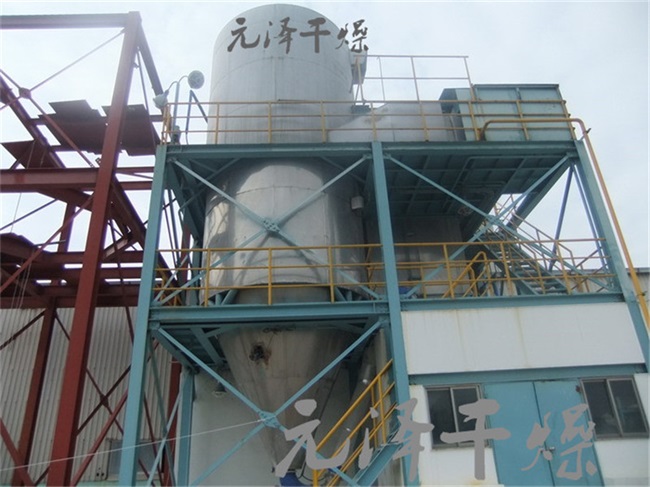 壓力式噴霧干燥機工作過程為:料液通過隔膜泵高壓輸入,噴出霧狀液滴,然后同熱空氣并流下降,大部分粉粒由塔底排料口收集,廢氣及其微小粉末經(jīng)旋風(fēng)分離器分離,廢氣由抽風(fēng)機排出,粉末由設(shè)在旋風(fēng)分離器下的收粉筒收集,風(fēng)機出口處還可裝備二級除塵裝置,回收率在96%-98%。