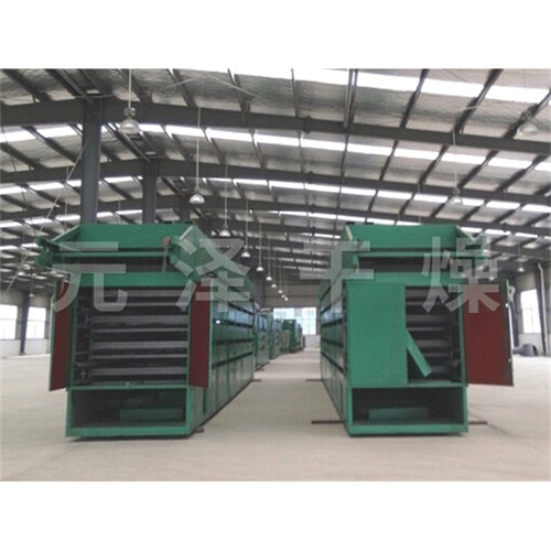 物料由加料器均勻地鋪在網(wǎng)帶上,網(wǎng)帶一般采用12-60目不銹鋼絲網(wǎng),由傳動(dòng)裝置拖動(dòng)在干燥機(jī)內(nèi)移動(dòng)。干燥機(jī)由若干單元組成,每一單元熱風(fēng)獨(dú)立循環(huán),部分尾氣由專門排濕風(fēng)機(jī)排出,廢氣由調(diào)節(jié)閥控制,熱氣由下往上或由上往下穿過(guò)鋪滿物料的網(wǎng)帶完成熱量與質(zhì)量傳遞的進(jìn)程,帶走物料水份。網(wǎng)帶緩慢移動(dòng),運(yùn)行速度可根據(jù)物料溫度自由調(diào)節(jié),干燥后的成品連續(xù)落入收料器中。上下循環(huán)單元根據(jù)用戶需要可靈活配備,單元數(shù)量亦可根據(jù)需要選取。