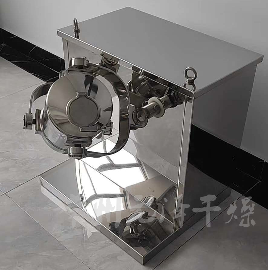 該機(jī)由機(jī)座、傳動(dòng)系統(tǒng)、電器控制系統(tǒng)、多向運(yùn)動(dòng)機(jī)構(gòu)、混合筒等部件組成。與物料直接接觸的混合筒采用優(yōu)質(zhì)不銹鋼材料制造,桶體內(nèi)外壁均經(jīng)鏡面拋光。