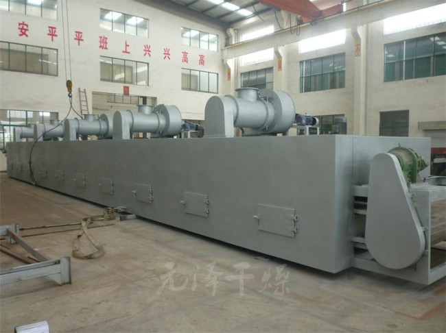 物料由加料器均勻地鋪在網(wǎng)帶上,網(wǎng)帶一般采用12-60目不銹鋼絲網(wǎng),由傳動裝置拖動在干燥機內(nèi)移動。干燥機由若干單元組成,每一單元熱風(fēng)獨立循環(huán),部分尾氣由專門排濕風(fēng)機排出,廢氣由調(diào)節(jié)閥控制,熱氣由下往上或由上往下穿過鋪滿物料的網(wǎng)帶完成熱量與質(zhì)量傳遞的進程,帶走物料水份。網(wǎng)帶緩慢移動,運行速度可根據(jù)物料溫度自由調(diào)節(jié),干燥后的成品連續(xù)落入收料器中。上下循環(huán)單元根據(jù)用戶需要可靈活配備,單元數(shù)量亦可根據(jù)需要選取。