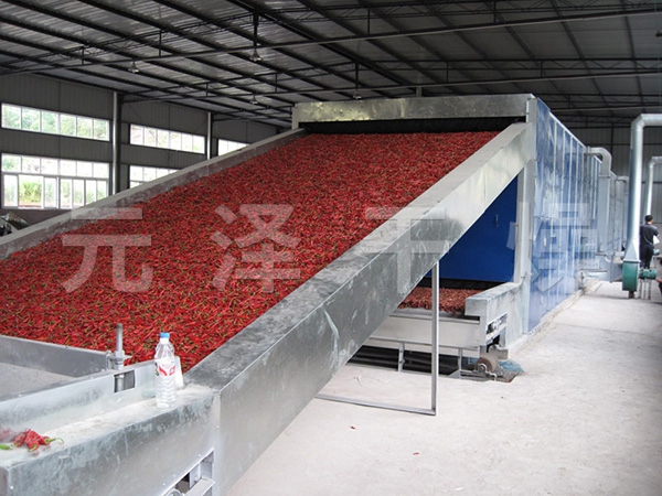 物料由加料器均勻地鋪在網(wǎng)帶上,網(wǎng)帶一般采用12-60目不銹鋼絲網(wǎng),由傳動裝置拖動在干燥機內(nèi)移動。干燥機由若干單元組成,每一單元熱風獨立循環(huán),部分尾氣由專門排濕風機排出,廢氣由調(diào)節(jié)閥控制,熱氣由下往上或由上往下穿過鋪滿物料的網(wǎng)帶完成熱量與質(zhì)量傳遞的進程,帶走物料水份。網(wǎng)帶緩慢移動,運行速度可根據(jù)物料溫度自由調(diào)節(jié),干燥后的成品連續(xù)落入收料器中。上下循環(huán)單元根據(jù)用戶需要可靈活配備,單元數(shù)量亦可根據(jù)需要選取。