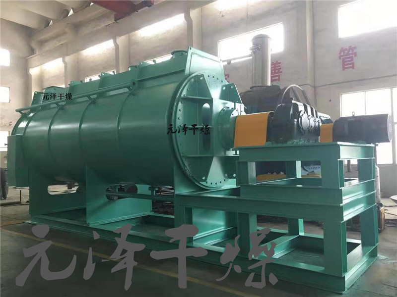 空心軸上密集排列著楔型中空漿葉,熱介質(zhì)經(jīng)空心軸流經(jīng)漿葉。單位有效容積內(nèi)傳熱面積很大,熱介質(zhì)溫度從-40℃到320℃,可以是水蒸汽,也可以是液體型:如熱水、導(dǎo)熱油等。間接傳導(dǎo)加熱,沒有攜帶空氣帶走熱量,熱量均用來加熱物料。熱量損失僅為通過器體保溫層向環(huán)境的散熱。楔型漿葉傳熱面具有自清潔功能。物料顆粒與楔型面的相對運動產(chǎn)生洗刷作用,能夠洗刷掉楔型面上附著物料,使運轉(zhuǎn)中一直保持著清潔的傳熱面。漿葉干燥機的殼體為Ω型,殼體內(nèi)一般安排二到四根空心攪拌軸。殼體有密封端蓋與上蓋,防止物料粉塵外泄而充分發(fā)揮作用。