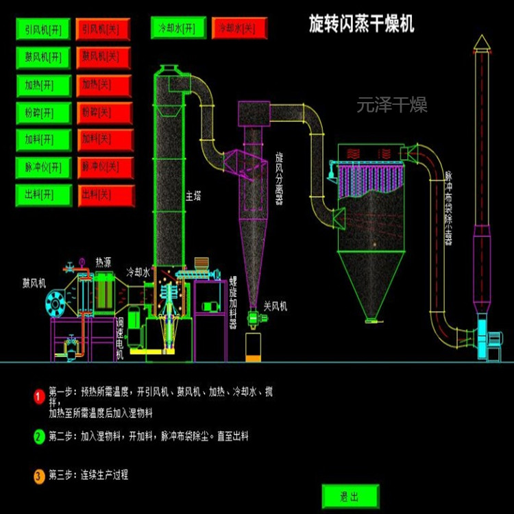 閃蒸干燥機(jī)是由熱空氣切線進(jìn)入干燥器底部,在攪拌器帶動(dòng)下形成強(qiáng)有力的旋轉(zhuǎn)風(fēng)場(chǎng)。物料由螺旋加料器進(jìn)入干燥器內(nèi),在高速旋轉(zhuǎn)攪拌槳的強(qiáng)烈作用下,物料受撞擊、磨擦及剪切力的作用下得到分散,塊狀物料迅速粉碎,與熱空氣充分接觸、受熱、干燥。干燥好的物料被氣流攜帶進(jìn)入收塵系統(tǒng)進(jìn)行收集處理,符合環(huán)保要求含塵量50mg/m3的尾氣由引風(fēng)機(jī)排空,完成整個(gè)干燥過程。